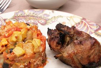 On la surnomme à la maison, la ratatouille tunisienne, car sa composition et sa cuisson se rapproche de la fameuse ratatouille niçoise. Notre famille étant recomposée, nous aimons retrouver certaines ressemblances dans nos cuisines respectives, toute deux méditerranéennes. Le kafteji est un plat composé principalement de légumes et il est épicé et pimenté. Les légumes sont cuits un à un en friture, puis mélangés ensemble et assaisonnés d’harissa et de kerouia (carvi moulu). Ce plat peut servir de garniture d’une viande grillée ou de saucisses, traditionnellement du fois ou des merguez. Ici, il accompagne merveilleusement bien une épaule d’agneau confite au barbecue… Un vrai délice !
