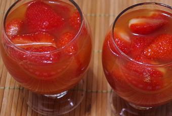 Rincez et équeutez les fraises. Mélangez le jus des oranges avec le sirop filtré. Versez sur les fraises et mélangez bien. Couvrez et laissez reposer au moins 2h.