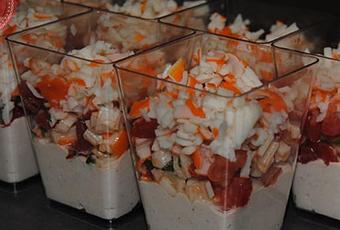 Monter les verrines en répartissant la mousse de thon puis les tomates et enfin le reste du surimi haché.