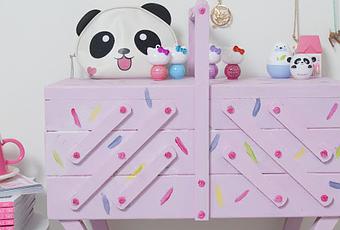 Il aura fallu pas moins de trois couches de rose ( après un minimum de ponçage bien sûr ) pour réussir à avoir un aspect uniforme.Puis quelques touches de couleurs façon confettis et voilà que ma travailleuse reprend du service !