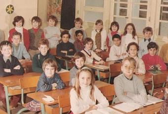 Les tables sont de tailles adultes mais impossible de ne pas se souvenir à quel point les nôtres pouvaient être petites pour des adultes : la table pour deux, avec la double barre au milieu pour relier les chaises, les casiers en bois ou métal pour ranger les affaires, le trou pour l'encre, la rainure pour poser les stylos ; les cartes de France, d'Europe et du Monde avec leur typo très simplifiée ; les rayonnages de livres vieillis et jaunis ; ... Ah, l'école primaire de notre enfance, que de souvenir ....! Tout y est pour nous transporter dans nos souvenirs. Le personnel très sympathique nous apporte alors la carte des vins pour l'apéro dans une couverture de cahier. Vraiment, tout y est. Comme à la cantine, l'eau est servie dans les bons vieux verres Duralex ronds.