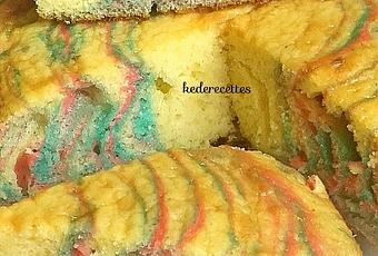 Divisez la pâte en 3, colorez 2 d'ente elle puis dans un moule à manqué mettre au centre une càs de pâte blanche, dessus une càs de pâte colorée puis en encore dessus une càs de l'autre pâte coloré et ainsi de suite jusqu'à épuisement de la pâte.