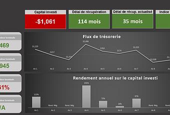 En somme, vous devez entrer certains paramètres pour définir le taux d’actualisation des flux monétaires et la valeur terminale du projet (s’il y a lieu) et ensuite, vous devez entrer les flux monétaires du projet, dans une grille conçue à cet effet. Finalement, vous pouvez consulter un tableau de bord pour obtenir la valeur de vos différents indicateurs de performance, ainsi que l’évolution des flux monétaires de votre projet et des rendements annuels sur le capital investi.