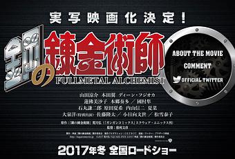 Le manga Fullmetal Alchemist (Hagane no Renkinjutsushi) d’Hiromu ARAKAWA va connaître une adaptation en film live. Produit par Warner Bros., ce long-métrage en prises de vues réelles est prévu pour une sortie à l’hiver 2017 au Japon. Dans le rôle d’Eward ELRIC on trouvera Ryôsuke YAMADA, Tsubasa HONDA dans celui de Winry ROCKBELL, Dean FUJIOKA jouera Roy MUSTANG, Misako RENBUTSU …