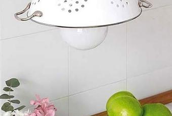 Transformez une vieille passoire en lampe de cuisine. Vous pouvez faire la même chose avec des vieilles râpes.