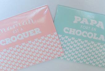 Pour maman, un étui estampillé « Ma maman est à croquer », et pour papa, un étui où est inscrite la phrase « Mon papa fort en chocolat ». Chacun des étuis est composé de 12 carrés de chocolat enrobés de mots d’amour : « je t’aime maman » ou « je t’aime papa » . Ces tablettes aux couleurs pastel sont parfaites pour les parents addicts au chocolat, elles comprennent aussii bien du chocolat noir que du chocolat au lait.