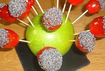 8 tomates cerises sur des batonnets-100g de sucre-1 cas de graines de pavot -.une pomme verte