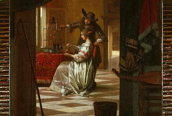 En comparaison, De Hooch édulcore le sujet : scène d’intérieur, perroquet austère récompensé d’un biscuit trempé dans du vin. Compte-tenu de la cithare dans l’antichambre, la jeune fille est musicienne, et le sous-titre pourrait être « Leçon de chant à mon oiseau ». C’est ici que le décor « à la Hoogstraten » prouve son efficacité : la pièce obscure, l’ombre chinoise des clés ou du manche de la cithare, le balai calé contre la porte suggèrent la présence d’une servante voyeuse, et donc d’une scène à épier. Dès lors le sujet apparent – « Jeune fille faisant boire un oiseau » se double d’un sujet moins innocent – « Jeune homme ouvrant la porte d’une cage » (l’objet qu’il tient dans sa main semble être une clé).
