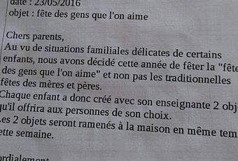 Ce message a fait un petit buzz dernièrement sur les réseaux sociaux. Il propose de remplacer la fête des mères et celle des pères par la « fête des gens que l’on aime ». Concrètement, les enfants prépareront à l’école deux objets qu’ils offriront aux personnes de leur choix.Belle idée. Comme l’a écrit Bernard De Vos Dumont, Délégué général aux droits de l'enfant, à la Communauté française de Belgique, les familles « sont désormais pluriparentales, nucléaires, adoptantes, homoparentales, monoparentales, recomposées : les modèles familiaux ont véritablement explosé au cours de ces dernières décennies. Alors quand l'école se met au diapason de ces évolutions, il n’y a aucune raison de bouder son plaisir » !