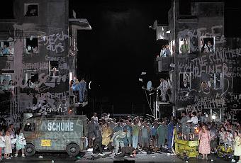 David Bösch situe l´action dans une contemporanéité aux dates incertaines, quelque part entre les années 50 et la fin du siècle dernier, entre l´ère des crochets de village et celle des antennes paraboliques ou des portables qu´on demande d´éteindre en entrée de spectacle. L´ancienne Nuremberg fait place à une banlieue misérable bâtie de pauvres petits immeubles à appartements aux parois grisâtres de béton nu, un décor de Patrick Bannwart qui alterne avec un podium de bois de piètre qualité ceint de cordes comme celui d´un ring de boxe et entouré d´échafaudages métalliques qui supportent quelques plate-formes et une série de projecteurs d´éclairage, et qu´on gravit par des échelles. Des artisans gagne-petit y survivent tant bien que mal, Hans Sachs confectionne ou répare des chaussures avec pour toute échoppe une vieille camionnette-fourgon déglinguée, son apprenti David circule à mobylette et s´endimanche pour rencontrer sa belle Magdalene. Seul le bijoutier Pogner semble disposer d´une certaine aisance comme en atteste sa BMW(dont les connaisseurs reconnaîtront sans peine le millésime) et le fait qu´il sponsorise le concours de chansons de la cité. L´appartenance à une confrérie de maîtres chanteurs aux règles innombrables contenues dans de vieux dossiers de bureaux console toutes ces personnes de leurs existences sordides. C´est dans ce milieu étriqué que débarque Stolzing, en blouson de cuir et guitare à la main, un type qui semble sorti d´un roman de Kerouac et pour qui la poésie et le chant n´ont que faire des règles empoussiérées, auxquelles certains maîtres semblent tenir comme à la prunelle de leurs yeux. Une querelle des anciens et des modernes version Wagner. Le concours semble organisé comme pour être filmé (comme en témoigne le panneau portant un "Bitte, Ruhe", équivalent du "Silence on tourne"). Une procession passe, comme on en voit pour la Fête-Dieu, un prêtre entouré d´acolytes portant très haut le Livre Saint suivi de porteurs d´une statue de bois représentant un Christ avec dans les bras croix et agneau. On est la veille de la Saint Jean, et comme le prix du concours est la main d´Eva, c´est aussi une "Polterabend", une de ces soirées allemandes où l´on casse de la porcelaine pour souhaiter bonheur au couple dont on va célébrer les noces le lendemain. Ici, dans le pauvre quartier populaire de David Bösch, la Polterabend se transforme en une révolte populaire, des casseurs peinturlurent les murs des maisons de grafitis (le A de Anarchie) ainsi que la camionnette de Hans Saschs, dont l´enseigne de néons qui formaient les lettres de son nom, Sachs, se voit détériorée, ne laissant plus qu´un "Ach!", "Ach" comme dans "Ach was (allons bon!)" ou "Ach du mein lieber Gott! (Oh mon Dieu!)". Le jour de la Saint Jean, pour le concours, David Bösch et Patrick Bannwart nous donnent un superbe tableau qui occupe toute la scène, avec le podium-ring au centre entouré des échafaudages portant des grandes banderoles de tissu blanc et dont les plates-formes supportent les choeurs faisant foule. A droite de la scène Pogner et sa fille toute de blanc vêtue occupent une plate-forme. A l´arrière-plan, sur un écran parfois brouillé de neige comme un téléviseur, défilent la projection en noir et blanc de publicités d´une autre époque (Travail vidéo de Falko Herold).