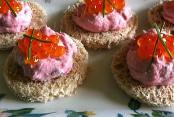 Poser sur chaque canapé 1 cuillère à café de tarama, 1/2 cuillère à café d'oeufs de saumon.