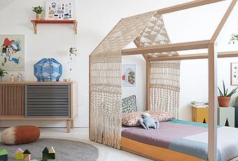 Comme pas mal de monde, je me suis laissée séduire par le grand retour du macramé, cette technique de nouage qui permet de réaliser toutes sortes de jolis objets pour la maison. J'aime son petit côté vintage, naturel et authentique. Rien qu'à regarder c'est apaisant ! Alors je me suis demandé ce que ça pouvait donner côté kids ? Et bien figurez-vous qu'il y a pas mal de choses sympas à imaginer et à créer : un ciel de lit, un lampadaire, une guirlande, une jolie étagère, et pourquoi pas même un joli berceau ! Bon celui-là à faire maison, il est pas simple, alors vous pouvez opter direct pour celui de Rock that Label pour une chambre de bébé so bohème :-)