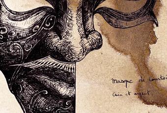 " ─ Mazette, lâche un des agents de Girard, voilà qui est bien sophistiqué pour un local à charbon ! " " Le duc de l'Abey raccroche son combiné, regarde de l'autre côté de son bureau, dans le vide, et se laisse aller à un dernier commentaire... ─ Toute revanche est bonne à prendre... " " Devoir attendre l'heure du laitier pour un poseur de bombe ! Vivement que ce gouvernement vote les lois scélérates " " ─ Par ordre alphabétique, vous cumulez l'agoraphobie, l'amaxophobie, l'anthropophobie, l'apopathodiaphulatophobie, la blemmophobie, la coulrophobie, la cuniculophobie, la gymnophobie, la gynéphobie, l'hippophobie, l'iatrophobie, la logophobie, la myxophobie, la nosocomephobie, l'ornithophobie, et la sociophobie. Le Khan ne répond pas. ─ Bon, je peux en oublier " " ─ Pas dans le dortoir, monsieur. Vous pensez ! Il faut tout de même que l'on puisse se reposer ! " " ─ Il le faut pourtant, laisse tomber le Notaire en remettant son masque blanc sur le visage. Pour le symbole. Et parce que c'est mon rôle. Même si, d'après vos rapports, le prix à payer peut être ce qui me reste de vie. " Le moment est historique. "+ Petit bonus du jour, un demi-masque en cuir de buffle noir, inspiré par des motifs indochinois, qui aura un rôle central dans le Chrysanthème Noir (dessiné par mes soins, pour plus de fun...)