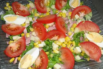 Couper la tomate en fins quartiers, le gruyère en cubes, le jambon en petits morceaux, l'oeuf en quatre puis disposer dans l'assiette avec le maïs.