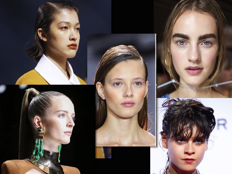 Mouillé:Une tendance qui revient souvent et qui se révèle très utile quand on n'a pas le temps de se sécher les cheveux avant une sortie: "non, je ne suis pas débraillée, je suis hyper à la mode!". Sinon ça donne aussi des idées de coups de peigne au sortir de la piscine ou de la mer!