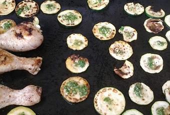 4- Sur la Plancha Préchauffée, déposez un peu d'huile d'olive et déposez les rondelles de courgette.