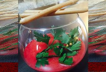 Cette recette est hyper simple et rapide à préparer avec ce que vous avez dans votre frigo – ou presque. Mon gaspacho est un peu revisitéavec des betteraves en plus… Et pour en faire un plat principal vous pouvez ajouter quelques dés de jambon cru – espagnol de préférence. Et si vous avez pas de poivrons mais de la mozzarelle optez pour ma version italienne de la recette du gaspacho.