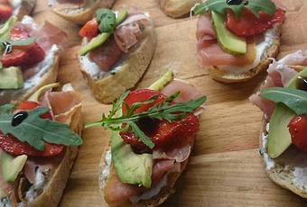 Une bruschetta est un hors-d'œuvre italien. Généralement une tartine de pain grillée frottée d'ail, arrosée d'huile d'olive et garnie de petits morceaux de tomates, assaisonnée de basilic.