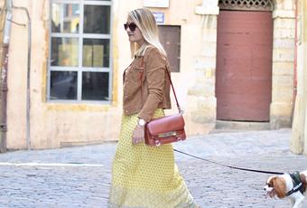 => Robe Longue Jaune IRL Summer ShowroomPrivé=> Lunettes de Soleil Prada via OpticalH=> Veste en Daim Camel Cache Cache=> Sac PS11 Saddle Proenza Schouler=> Spartiate Dorée Achetée en Grèce=> Montre Dorée Klarf=> Bracelet Amour 1954 Bijoux