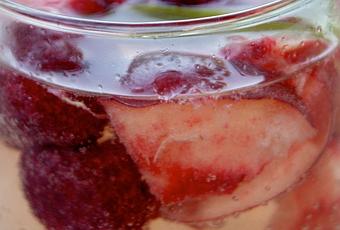 Les déposer dans un pichet suffisamment grand avec la verveine, le vin et la crème de pêches. Réserver au frais.