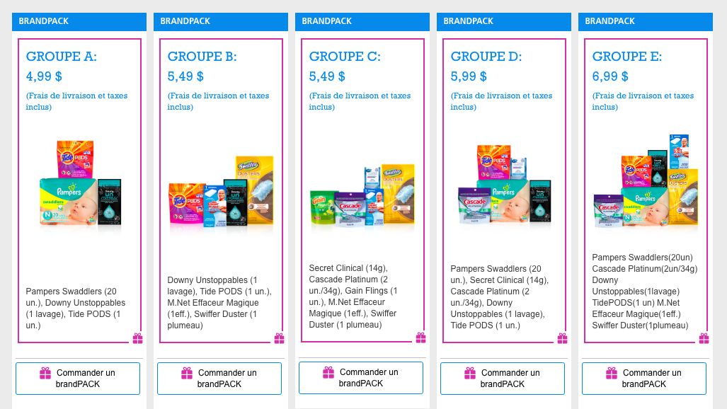 P&G vient de lancer un NOUVEL emballage brandPACK pour permettre aux consommateurs d'essayer leurs produits vedettes, dont Pampers, Tide, Swiffer, etc.