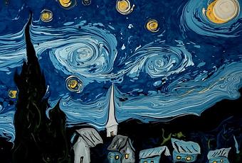 L’Ebru est l’art traditionnel Turc venu d’Asie mineure qui consiste à créer des motifs colorés en appliquant des pigments de couleur au goutte-à-goutte ou au pinceau sur de l’eau à laquelle on a ajouté des substances grasses dans un récipient, puis à transférer ce motif sur du papier. Déposées au goutte-à-goutte ou au pinceau sur une préparation de liquide épaissi, les encres de l’artiste Garip Ay vont faire apparaître La Nuit étoilée de Vincent van Gogh dans ce liquide sombre.