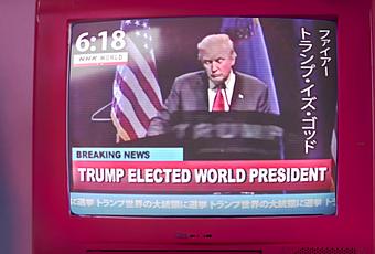 Fausse publicité mettant en vedette une Japonaise qui a pour idole Donald Trump, sa joie la transforme en superhéroïne lorsqu’elle apprend que le milliardaire américain est élu président du monde. Non, pas des États-Unis, du monde.