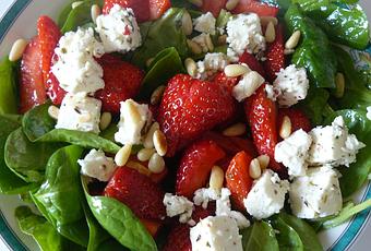 Répartir les pousses d'épinards dans des bols, ajouter les fraises, les pignons et la feta émiettée.