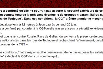 Ce moment hallucinant où un syndicat présenté comme terroriste et complice de casseurs par l’establishment et les médias main stream fait preuve de davantage de responsabilité que ce gouvernement en préférant renoncer à une manifestation sous la pression du chantage du représentant de l’Etat qui le menace de ne pas assurer la protection des manifestants contre des hooligans organisés en milices fascistes… CQFD. Ce pays va vraiment très mal. Drôle de hiérarchie des priorités…