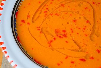 Servir la soupe bien chaude arrosée d'huile d'olive parfumée à l'ail et au cumin et de quelques pincées de piment doux ou fort selon le goût.