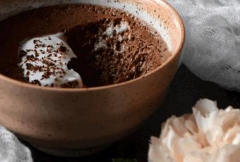 - 7. Au moment de servir, disposer sur chaque mousse au chocolat cru un peu de chantilly de coco, et parsemer de copeaux de chocolat noir 100% cacao.