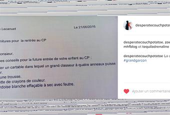 Un cartable ! Sérieux ? Ma crevette va avoir un truc cinq fois plus large que lui qui dépasse des épaules ? Ma toute petite crevette ?! Je revois encore la rentrée de petite section. On avait pris Monsieur et moi notre journée pour ce grand jour. A peine arrivé il a filé à l’espace petites voitures en nous faisant coucou. Bref, salut les gars ! Et on s’est retrouvés comme deux cons, les yeux tous mouillés. Ma meilleure amie venait d’accoucher, j’ai reçu une photo de sa petite, et en retour je lui ai envoyé celle de mon bébé à moi dans sa classe avec ce message : Aujourd’hui je le laisse à « l’autre femme »… Du coup avec Monsieur, on s’est fait un bon resto le midi, on se console comme on peut… C’était hier, quoi ! Et là le CP… Putain…