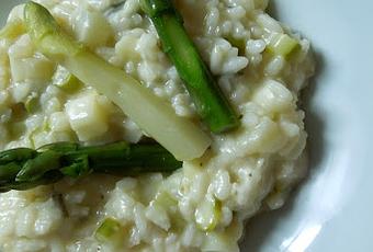 -200g de riz Arborio-15cl de vin blanc sec-3 oignons nouveaux -30 cl de bouillon de légumes-6 asperges vertes et 6 asperges blanches-huile d'olive, crème, gruyère râpé-sel, poivre