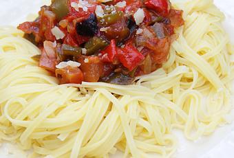 Servir les pâtes avec les poivrons et le parmesan râpé.