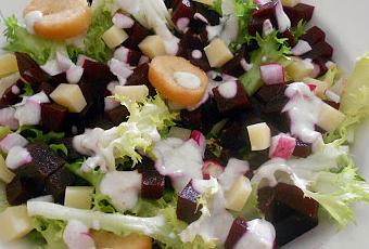 Nous sommes de gros consommateurs de salades. J'ai une grande essoreuse à salade qui est continuellement dans le frigo ou presque. On aime toutes les salades même s'il y a des variétés qu'on achète plus souvent que d'autres. La semaine dernière j'ai acheté une frisée pour changer. Elle était tellement énorme que j'ai du la laver en 3 fois dans mon essoreuse et d'en garder 1/3 dans mon essoreuse au frigo et les autres 2/3 lavés dans un torchon au frais! Du coup on en a consommé à toutes les sauces. Un soir j'ai concocté une petite salade avec les restes et je l'ai trouvé très sympa alors je la partage avec vous.