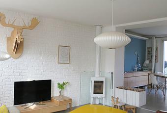 Avec cette nouvelle maison, nous tenions à imaginer un nid, tout aussi respectueux de la santé de nos enfants que de l'environnement. Nous avons, de fait, prêté beaucoup d'attention au choix des matériaux durables et naturels et à leur provenance, autant pour l'intérieur que pour l'extérieur de la maison. Ainsi, le bois de la terrasse est issu de forêts françaises. Il s'agit de robinier, un bois très résistant, autant si ce n'est plus que le teck, mais local lui ! Pour ce qui est du chauffage, haro sur les énergies nucléaires, nous avons fait le choix d'installer un poêle à bois norvégien (Jötul) alimenté par des bûchettes compressés, fabriquées à partir du recyclage de sciure.