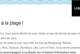 On ne peut pas dire que la situation ce soit améliorée ces derniers mois ! On a vu à en France ces derniers temps une forte tension s'installer entre le trio Taxis - Uber - Politiques, et bien que cela ce soit calmé, rien n'est réellement réglé. Cela n'empêche pas Uber de continuer à se développer, comme en témoigne cet email reçu il y a deux semaines, annonçant un service estival dans quelques grandes destinations côtières.