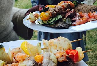 - Brochettes de poulet Bœuf L’Éclair mariné à la sauce d’huître, crevettes, ananas Victoria.