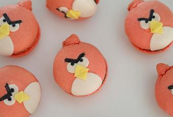 Dans la catégorie des macarons funs … voilà mes macarons Angry Birds ! Des coques rouges, décorées avec de la pâte à sucre pour faire apparaitre le visage de ce fameux petit oiseau énervé !!