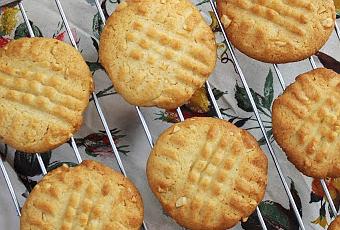 Préchauffez le four à 190°C. Tapissez deux plaques de cuisson avec du papier sulfurisé.Façonnez la pâte en boules de la taille d’une noix. Posez-les sur les plaques tapissées, en laissant une distance d’environ 7 cm entre les boules. A l’aide d’une fourchette, formez des croix sur le dessus des cookies en les aplatissant par la même occasion.