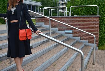 Comme elle se porte assez taille haute, j’ai opté pour un crop top manches courtes de chez Zara et pour une veste mi-longue de chez H&M. Les escarpins framboise viennent eux de chez Maniet (ancienne co) et le petit sac bandoulière de chez H&M lui aussi. J’aurais pu compléter mon look avec des accessoires noirs également pour jouer la carte du total look black mais j’avais envie de casser le côté trop sérieux de la tenue avec quelques touches de couleurs par-ci, par-là mais aussi avec ce superbe collier ethnique (collection Coachella) shoppé chez H&M également.