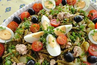 Salade d'Haricots verts et de Pommes de terre, garnie de tomates, thon, oeufs, olives