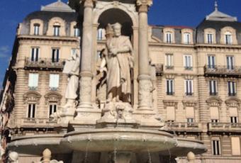 Globe-T. @ Lyon (France). La fontaine des artistes sur la Place des Jacobins honore quatre siècles d’art lyonnais à travers des statues représentant quatre artistes reconnus nés à Lyon.