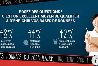 - Pensez à poser des questions. Qualifiez votre BDD en menant l’enquête. 48% des interrogés préfèrent participer à une enquête, 44% préfèrent répondre à un quiz et 42% préfèrent jouer à un instant gagnant.