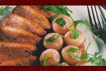Découpez les magrets en fines tranches et posez-les en éventail sur des assiettes chaudes, ajoutez les petits navets.