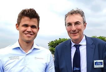 Rencontre en juin 2016 entre le champion du monde d'échecs Magnus Carlsen et Philippe Dornbusch sur la terrasse du siège de Vivendi à l'occasion du Grand Chess Tour de Paris - Photo © Chess & Strategy