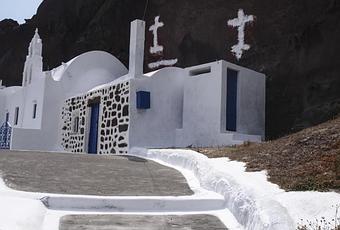 En partant du parking, le chemin part d’une petite église immaculée et emblématique de la Grèce.