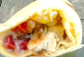 5- Tartinez les wraps de ricotta, puis déposez les lanières de poivrons marinés puis le mélange au poulet. Fermez les tortillas et mangez tout de suite avec une bonne salade verte pour nous.