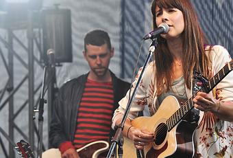 MAUDE AUDET a la charge ce dimanche 10 juillet d'ouvrir la journée de concerts au Festival d'été de Québec, qui prend des airs de Glastonbury. Heureusement les rafales de vent sont moins violentes que la veille et un petit public résiste vaillamment aux agressions du ciel. La Québécoise propose de la jolie chanson française romantique à sonorité folk par instants. Elle est accompagnée par une batterie, deux basses (dont un violoncelle), ainsi qu'un vibraphone. Originale formation ! Maude est souriante et reconnaissante aux festivaliers restés pour l'écouter : " Je trouve que ma musique va avec la pluie " lance-t-elle amusée. Et c'est plutôt vrai, on s'étonne à se dire " à la prochaine je vais me mettre au chaud " tout en repoussant l'échéance chanson après chanson, " Nous sommes le feu ", " Je t'en prie "... Il y a quelque chose de magnétique dans la musique de Maude : sa voix aux tonalités enfantines ou ce son plein apporté par ses instrumentistes ? Les touches de vibraphone ? Celles du violoncelle ? En tout cas le charme opère et il ne pleut presque plus.