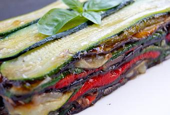Déposer par dessus une couche de courgettes, puis une couche de poivrons, puis d'aubergine, d'oignons, de basilic ciselé. Saupoudrer de fleur de sel.